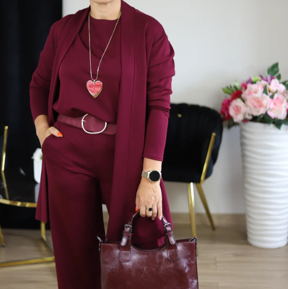👌 Alt-i-ett-look – cardigan, topp og bukse i samme sett.