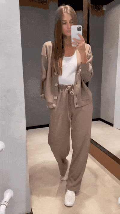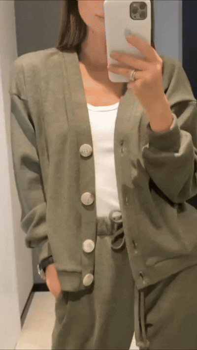 Dette strikkesettet i grønt gir deg en komplett look uten stress. Den kneppede jakken kan brukes både lukket og åpen, og buksene har en avslappet, men stilig passform. Laget i mykt materiale som gir deg både komfort og stil – perfekt for hverdagen, jobb eller en uformell kveld ute.
